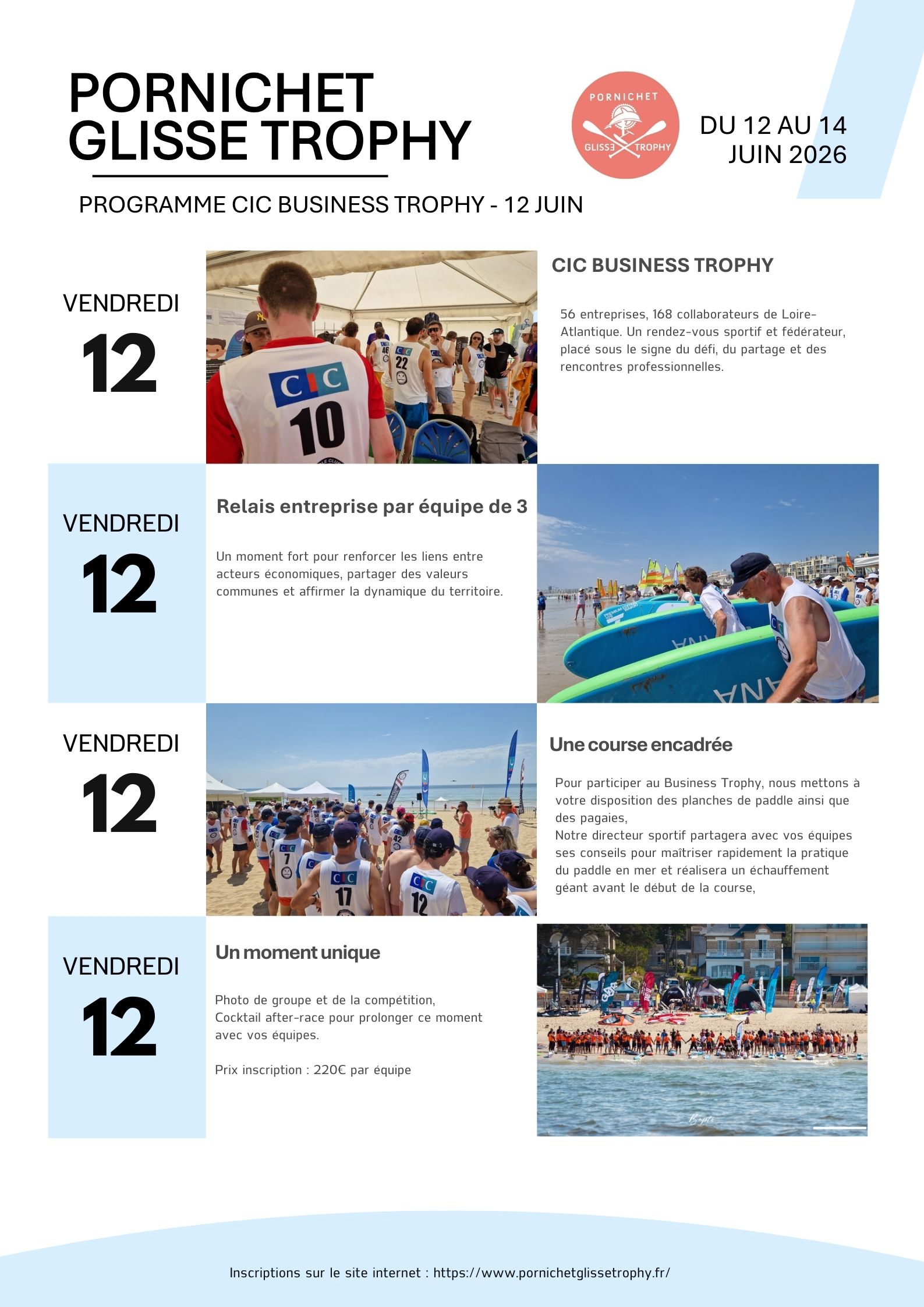 Le CIC Ouest Business Trophy est une épreuve de relais inter-entreprises (associations bienvenues !) par équipe de trois. L’occasion à la rentrée de passer un moment de team building fun et sportif, d’échanger avec d’autres entreprises de la région, et de rencontrer nos partenaires, VIP et champions.